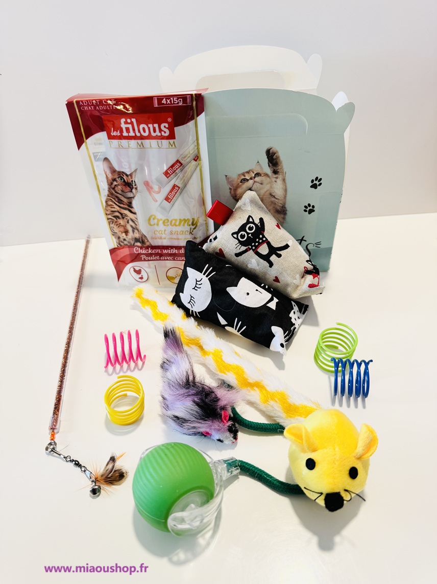 - C’est idéal pour Noël ou toute occasion où l’on veut faire plaisir sans chercher chaque article individuellement.Mix stimulation + détente. Des jouets qui bougent et attirent, et des articles apaisants naturels à la valériane ou à l’herbe à chat.